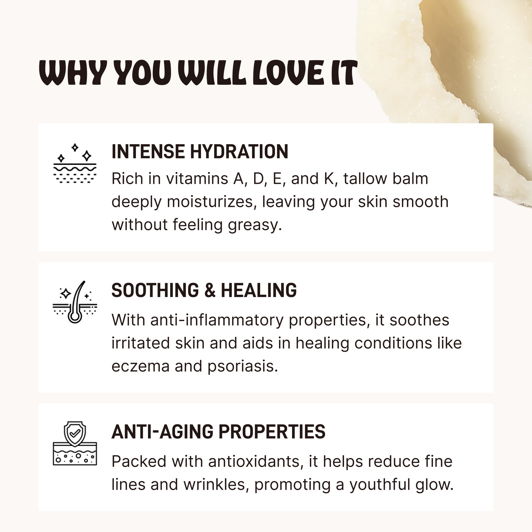 Naturally rich in vitamins A, D, E, and K, tallow helps rejuvenate skin, promoting a youthful, healthy glow.