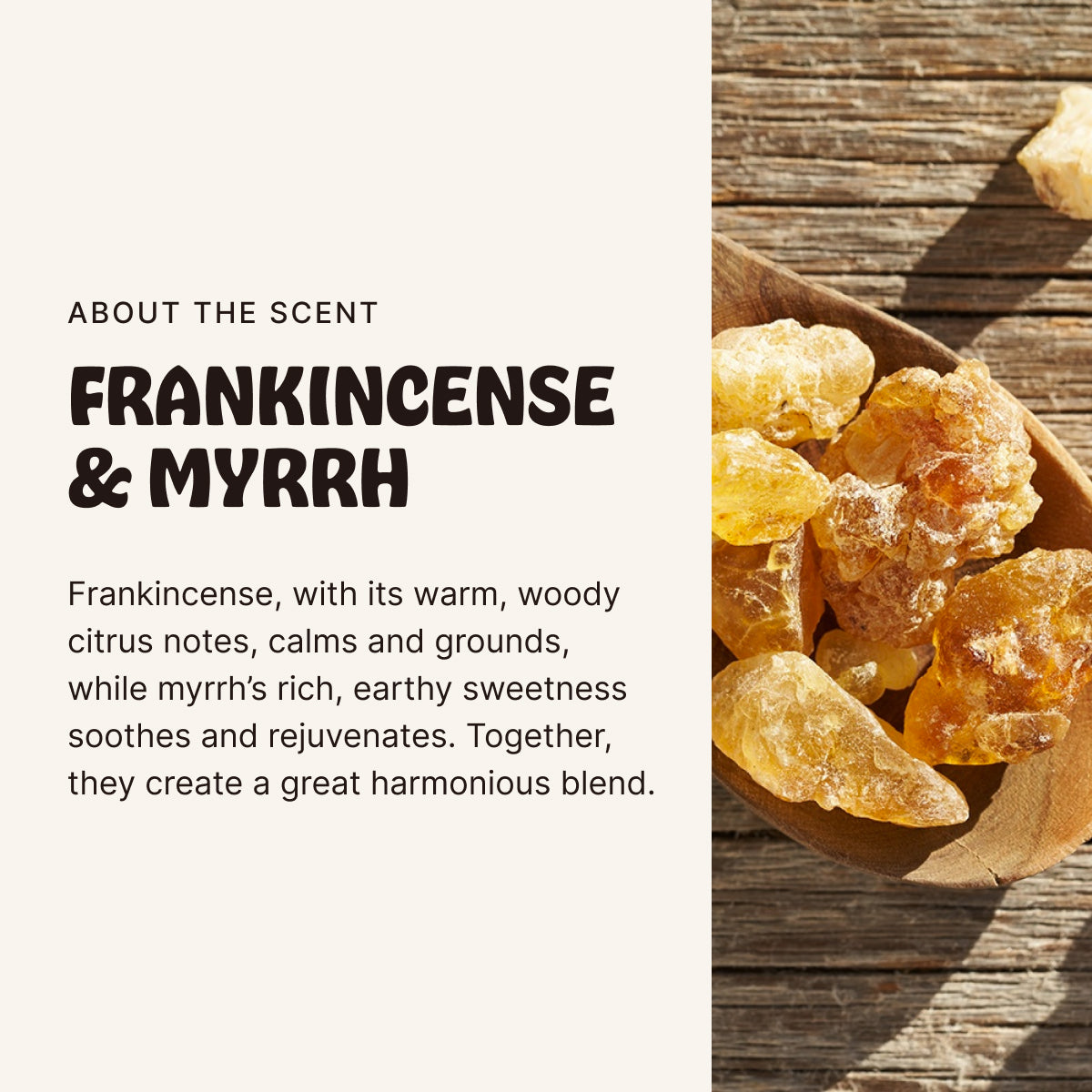 Frankincense, with its warm, woody citrus notes, calms and grounds, while myrrh’s rich, earthy sweetness soothes and rejuvenates.